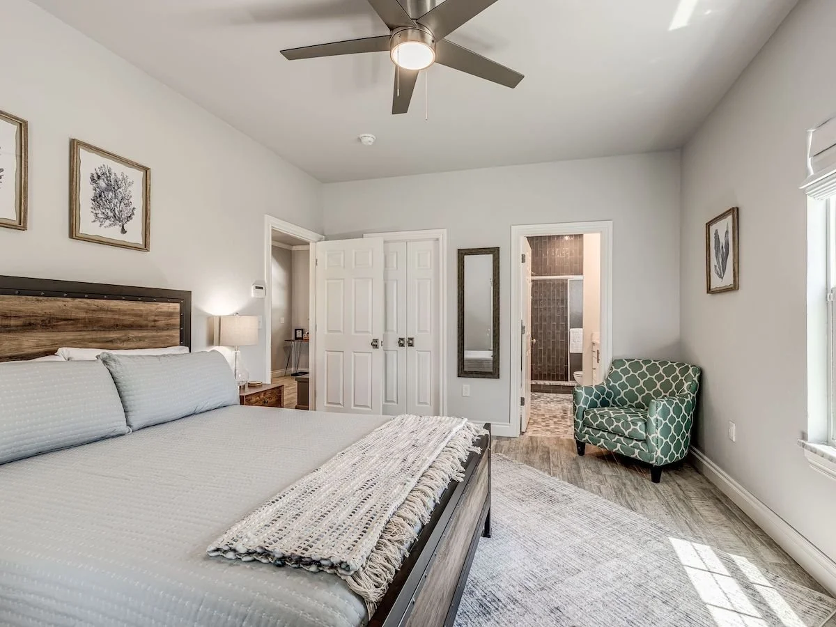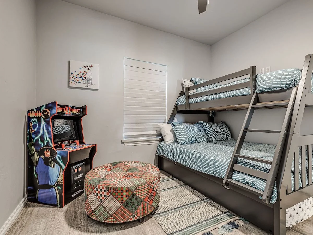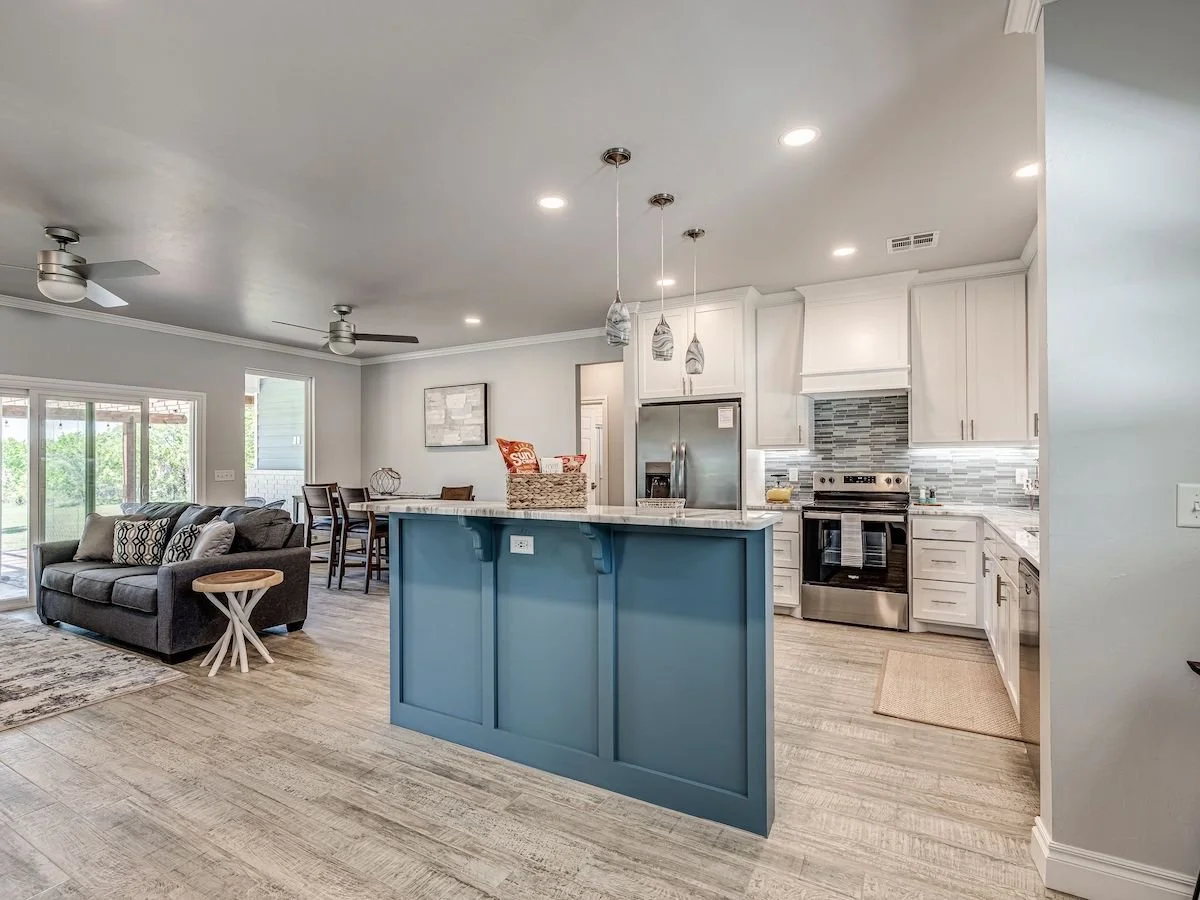 The Blue Oasis comfortably accommodates up to 8 guests. Sleeping arrangements include a cozy queen-sized bed in both the master suite and guest bedroom. An additional guest bedroom offers a twin over full bunk bed with a twin trundle underneath (no adults on the top bunk or trundle bed please).