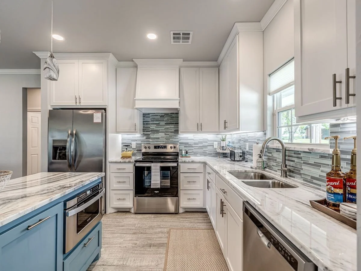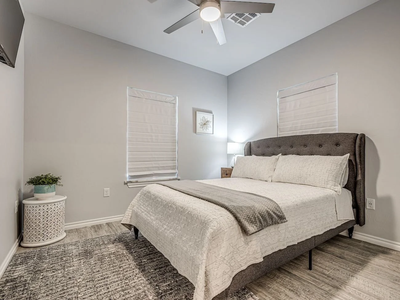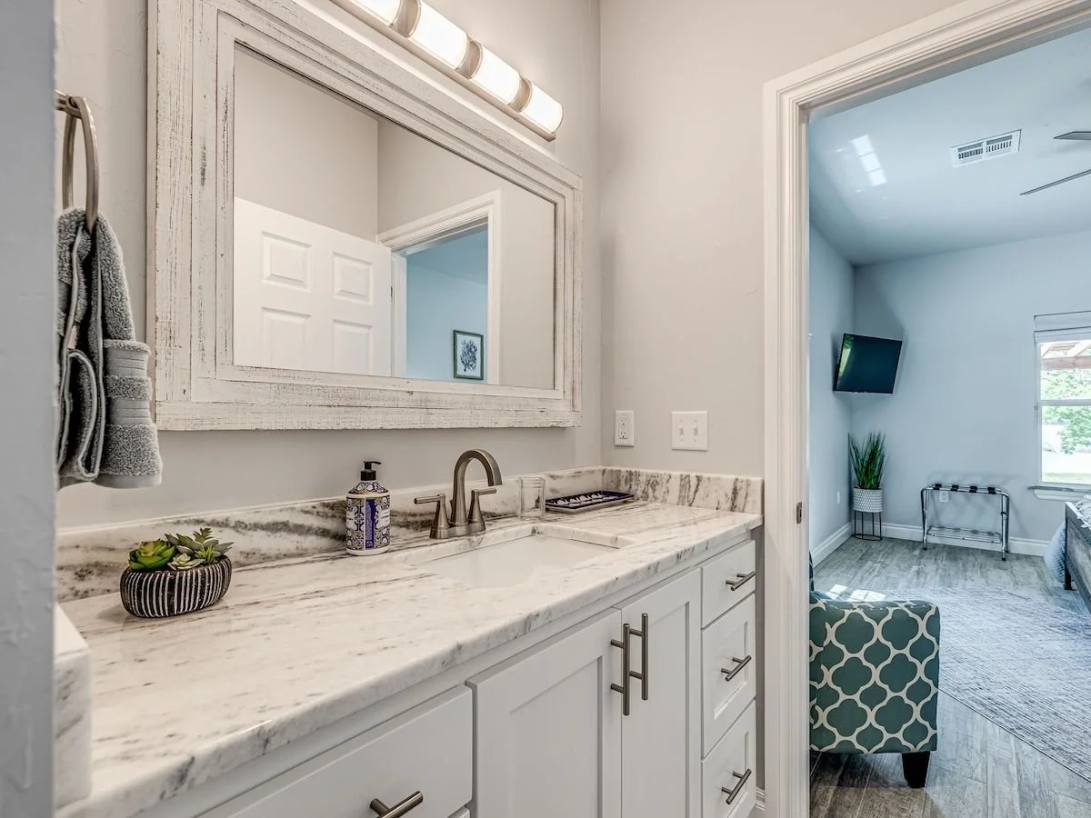 The Blue Oasis comfortably accommodates up to 8 guests. Sleeping arrangements include a cozy queen-sized bed in both the master suite and guest bedroom. An additional guest bedroom offers a twin over full bunk bed with a twin trundle underneath (no adults on the top bunk or trundle bed please).